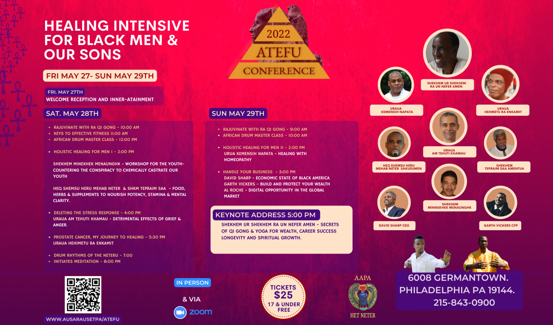 With more than thirty years of experience in teaching, Kamitic spirituality, yoga, Qi Gong and martial arts;Ur Aua is responsible for the administration of Ausar Auset Society's spiritual development programs throughout the Delaware Valley region. He has convened this years Atefu Conference to assist our brothers in meeting the challenges of violence and degenerative disease ravaging our communities nationwide.